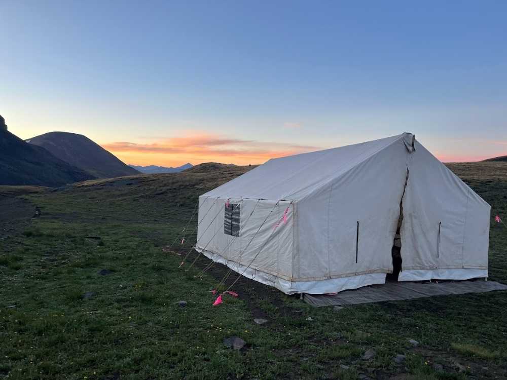 When you get into camp, the community tent will be up, the crew will be preparing the evening meal, and there will be snacks or hot soup to refresh you. The shower tent will be up and you will be provided with 2 ½ gallons of warm water to clean up with. We provide a mechanism that pumps warm water through a hose and out of a small plastic showerhead. While you are awaiting your turn to shower, this is the time to set up your tent, relax, eat, and get to know your fellow trekkers.