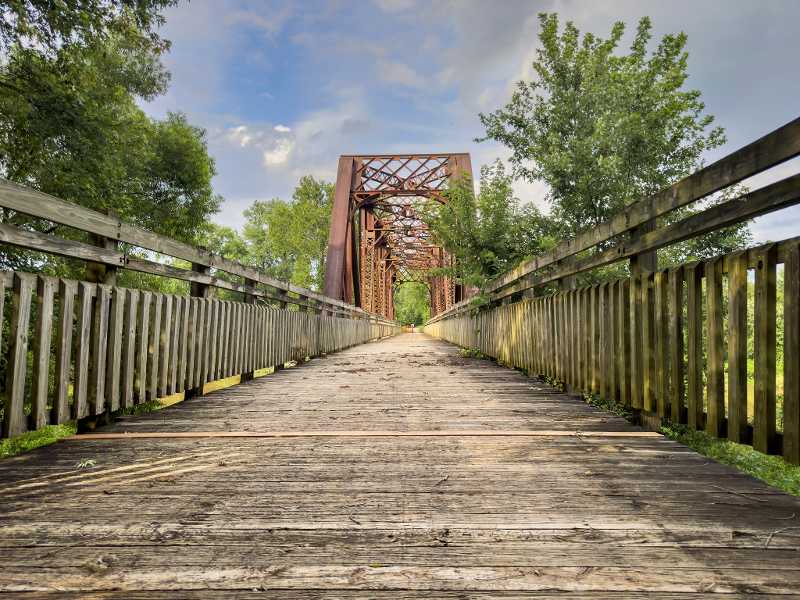 The Katy Trail State Park in Missouri is the longest continuous rail‑to‑trail route in the United States, stretching roughly 240 miles across the state on a flat, finely packed crushed limestone surface that is ideal for bicycle travel. The trail follows much of the former railroad corridor, tracing the Missouri River through forests, farmland, river bluffs, small historic towns, and scenic countryside. It’s a classic ride that suits those seeking a longer multi‑day journey with a relaxed paced on an easy trail. Because it was built on old railroad grades, the Katy Trail’s gentle grades and smooth surface make it easy for long distance riding.